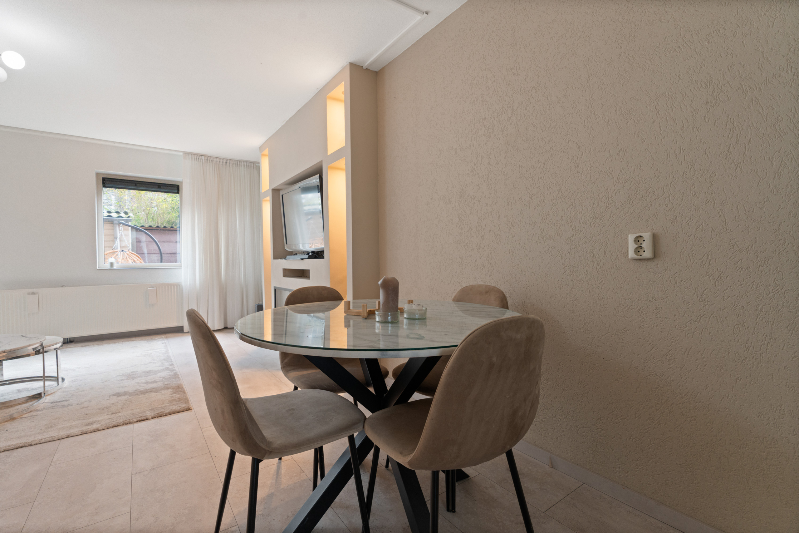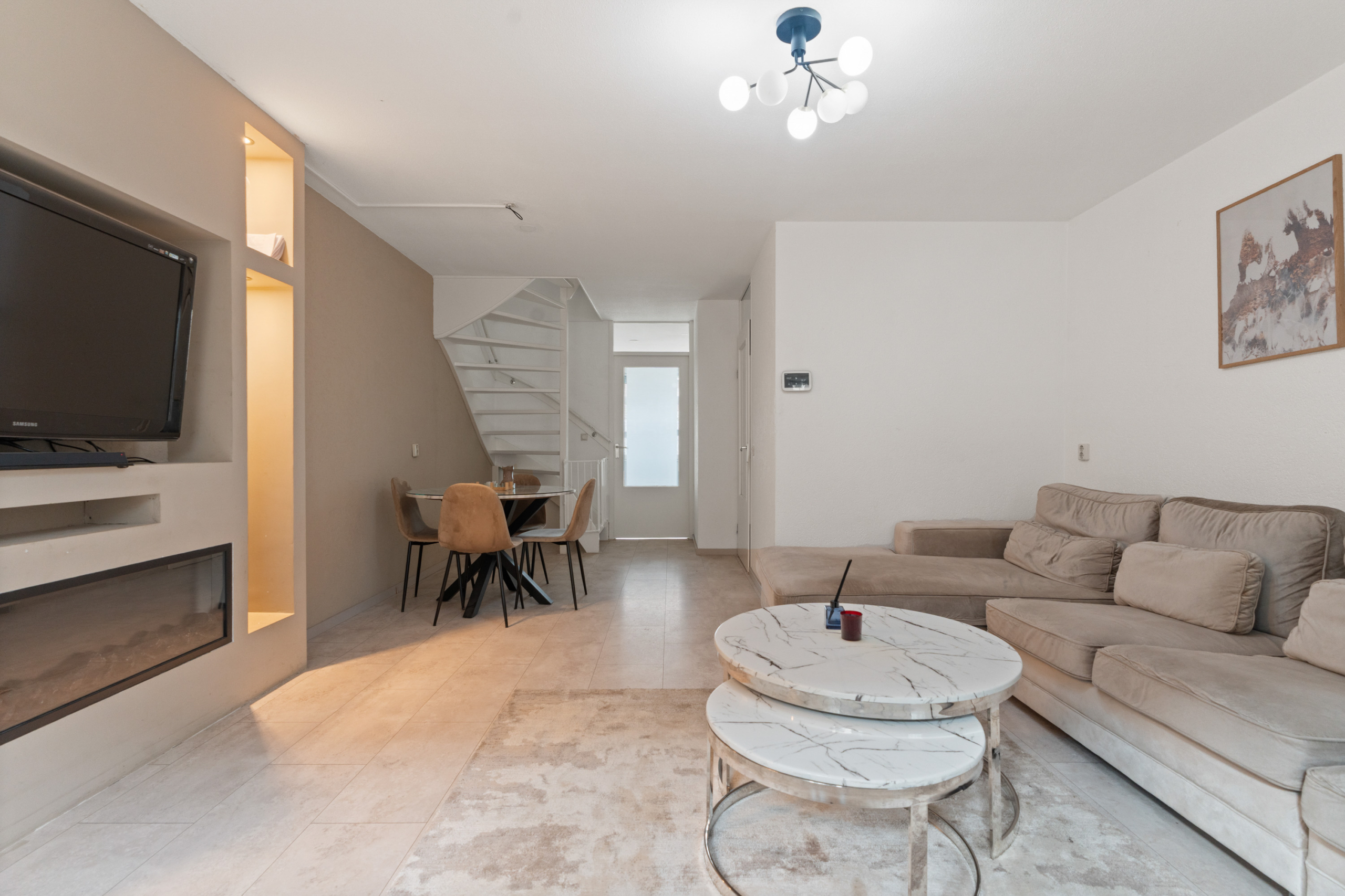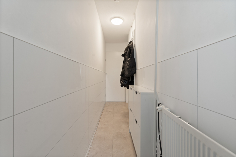 – Entree / hal: Binnenkomst in een verzorgde hal die toegang biedt tot de woonruimte en de trap naar de eerste verdieping. De hal is modern afgewerkt met een nette tegelvloer en strak gestucte wanden, wat direct een verzorgde indruk geeft.