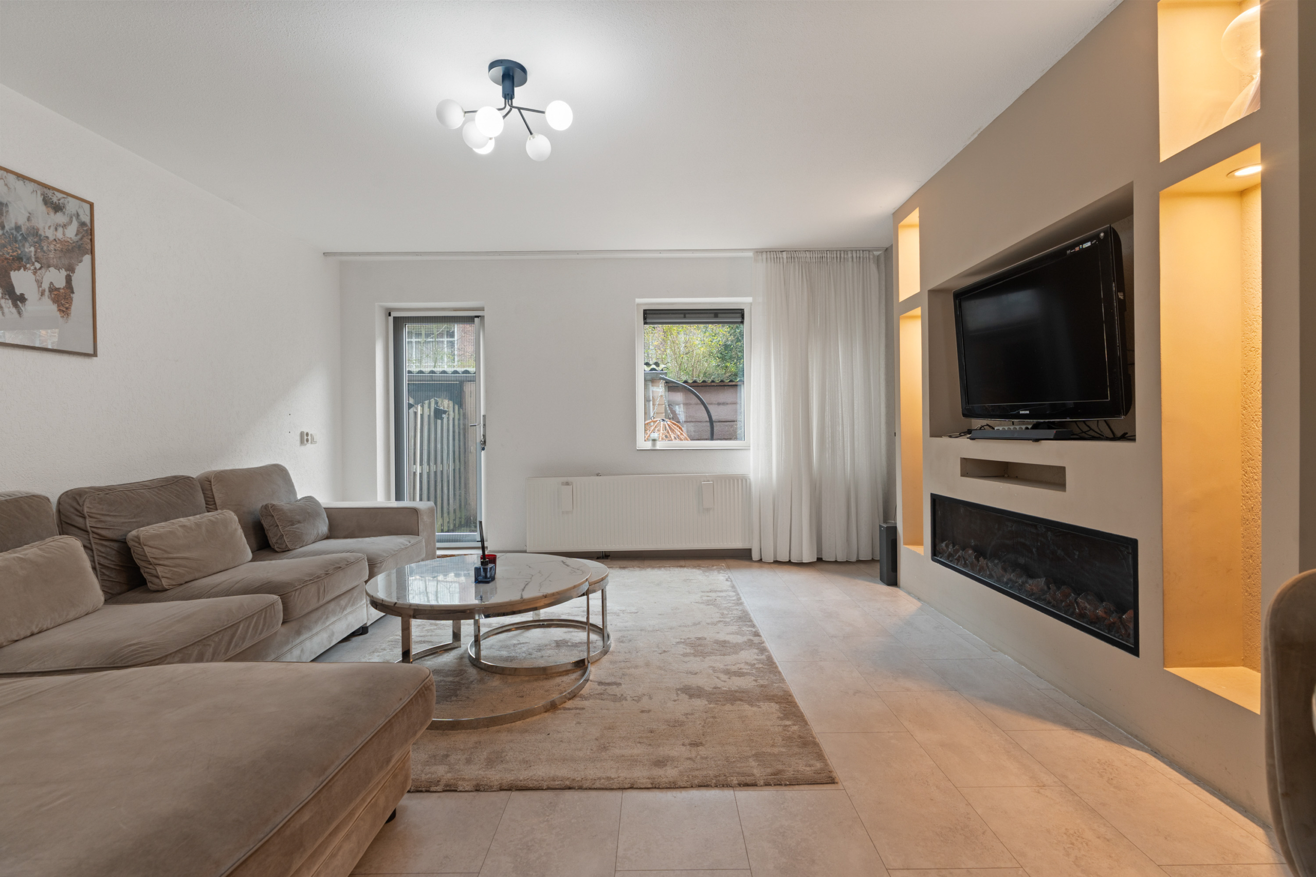 – Woonkamer: De woonkamer is ruim en heerlijk licht dankzij de grote raampartijen aan de achterzijde. Er is voldoende ruimte voor een comfortabele zithoek en een royale eethoek. De moderne cinewall met ingebouwde elektrische haard vormt een sfeervol middelpunt in de ruimte. De neutrale afwerking zorgt voor een goede basis die eenvoudig naar eigen smaak is in te richten.