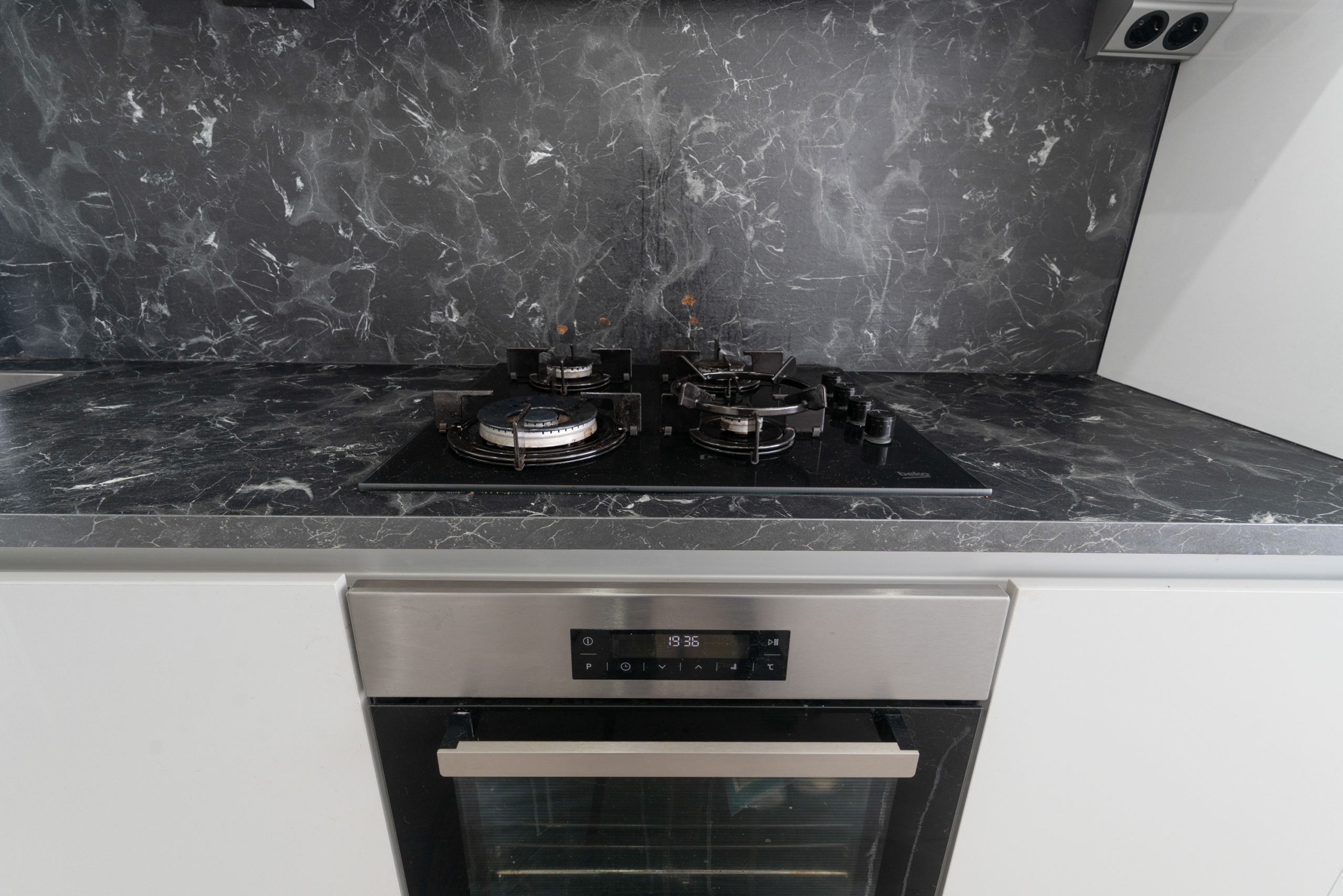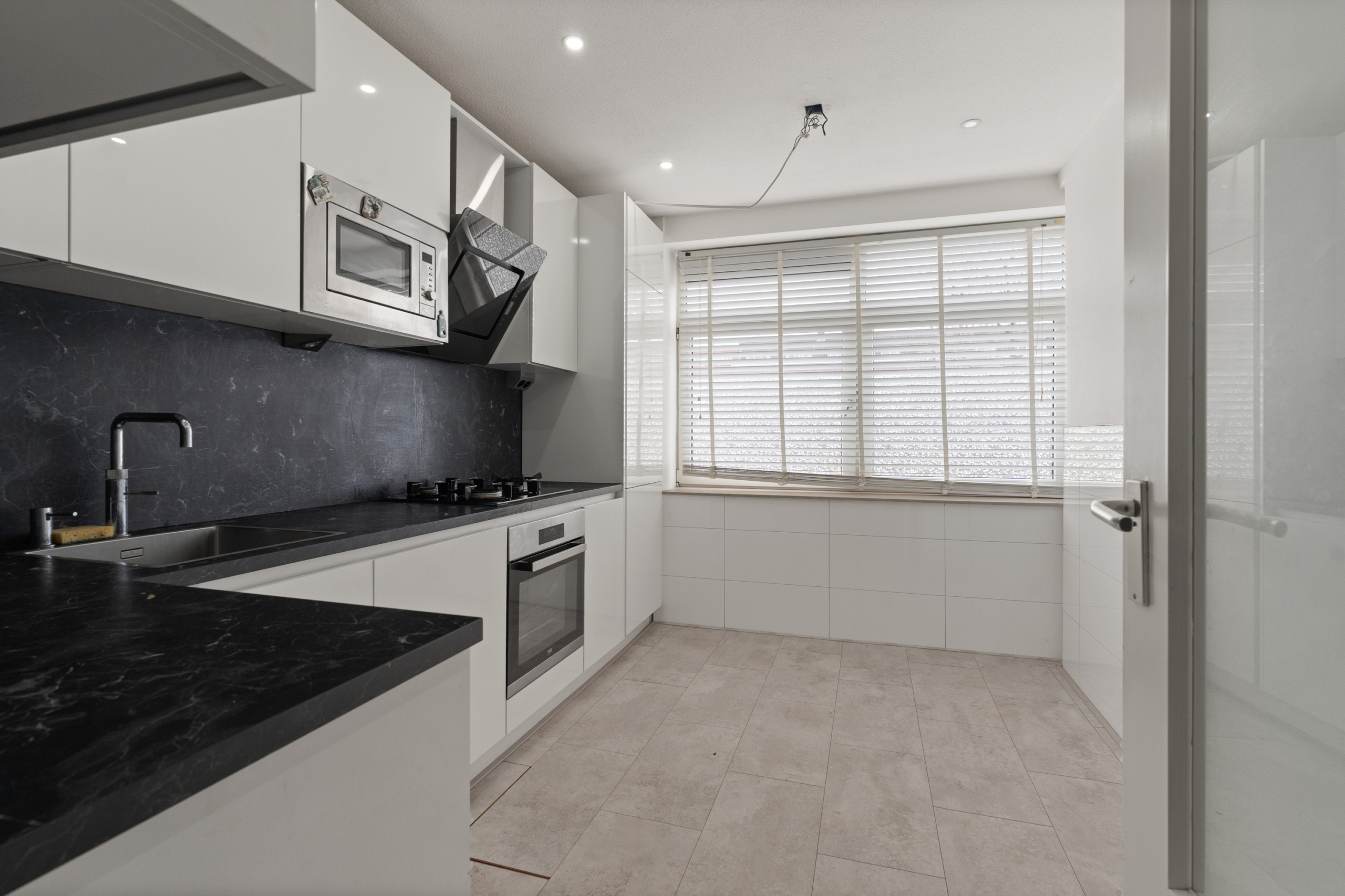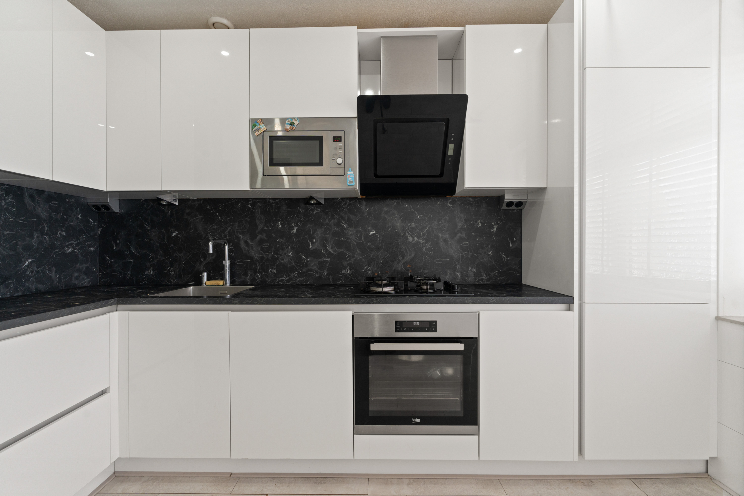 – Keuken: De keuken is modern uitgevoerd met hoogglans kastfronten en een donker werkblad. De keuken beschikt over diverse inbouwapparatuur, waaronder een kookplaat, oven en afzuigkap. Daarnaast is de keuken voorzien van een Quooker, wat zorgt voor direct kokend water en extra gebruiksgemak. Dankzij de praktische indeling is er voldoende werk- en opbergruimte. De strakke afwerking en het aanwezige daglicht zorgen voor een frisse uitstraling.