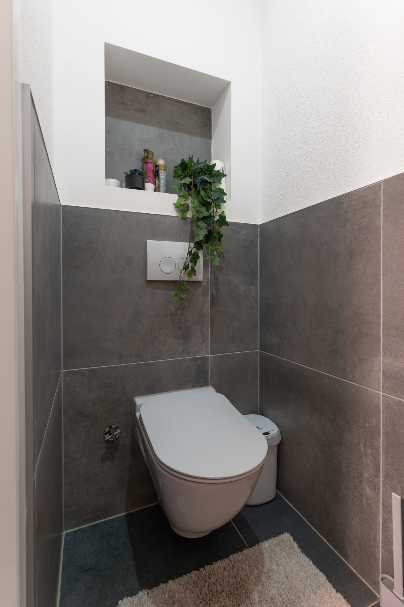 – Toilet: Modern afgewerkte toiletruimte met wandcloset, inbouwreservoir en volledige betegeling in neutrale tinten. De ruimte is praktisch ingericht en netjes onderhouden.