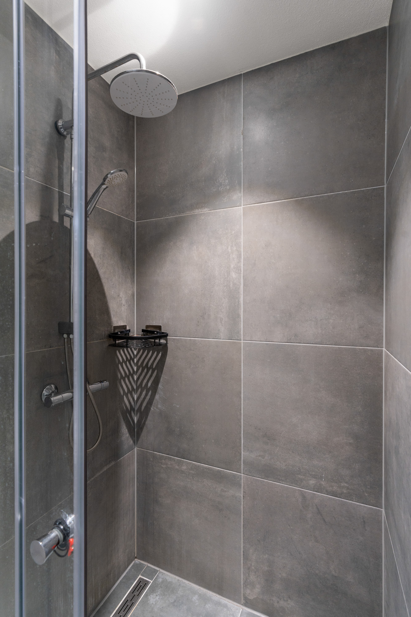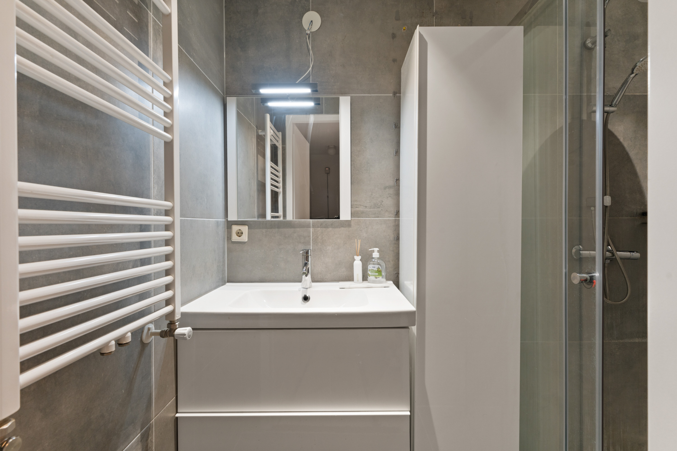 – Badkamer: De badkamer is modern en strak afgewerkt en volledig betegeld in een neutrale grijstint. De ruimte is voorzien van een inloopdouche met regendouche, een wastafelmeubel met spiegel en een designradiator. Dankzij de verzorgde afwerking en praktische indeling is de badkamer comfortabel in gebruik.