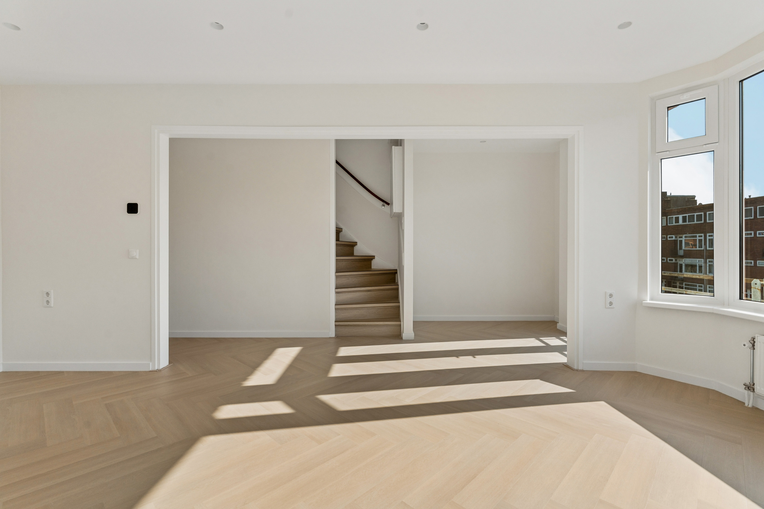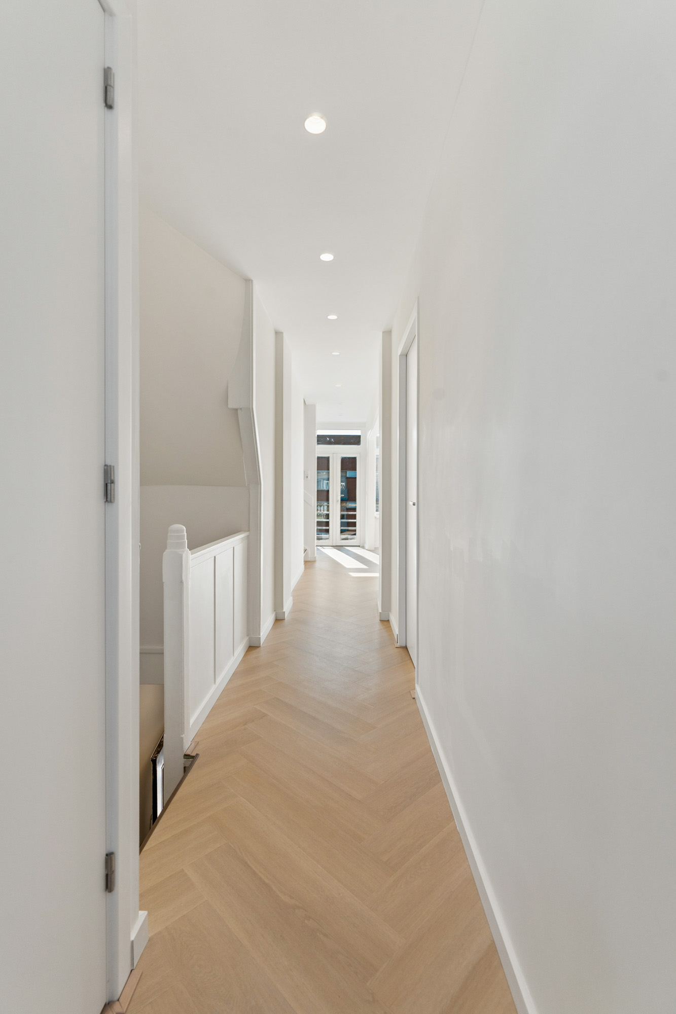 – Woonkamer: De ruime woonkamer is gelegen aan de achterzijde van de woning en beschikt over grote raampartijen en openslaande deuren naar het balkon. Hierdoor is de ruimte heerlijk licht. De woonkamer is strak afgewerkt met een lichte visgraatvloer, gestuukte wanden en plafonds met inbouwspots. Door de royale afmetingen is er voldoende ruimte voor een comfortabele zithoek en een ruime eethoek.