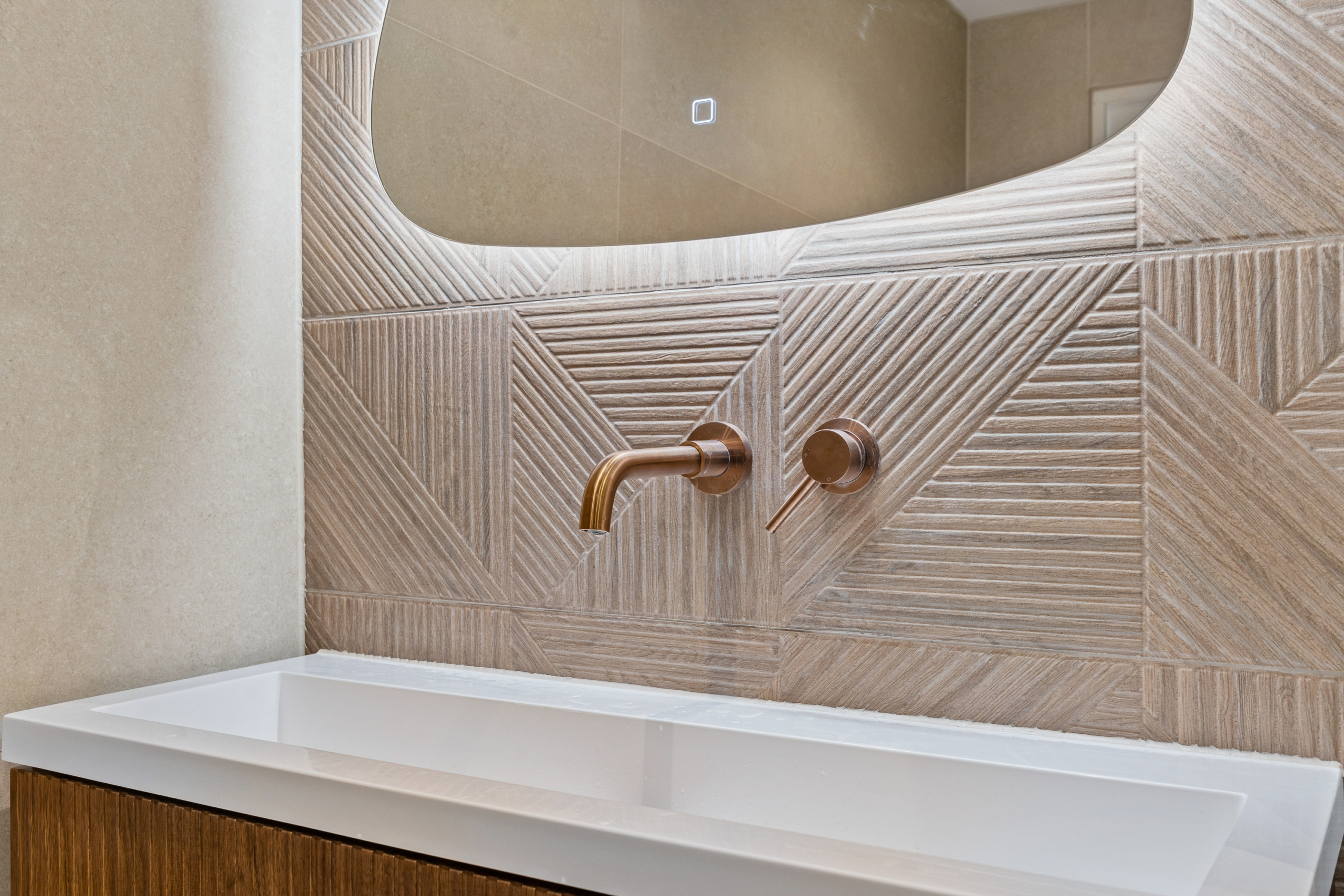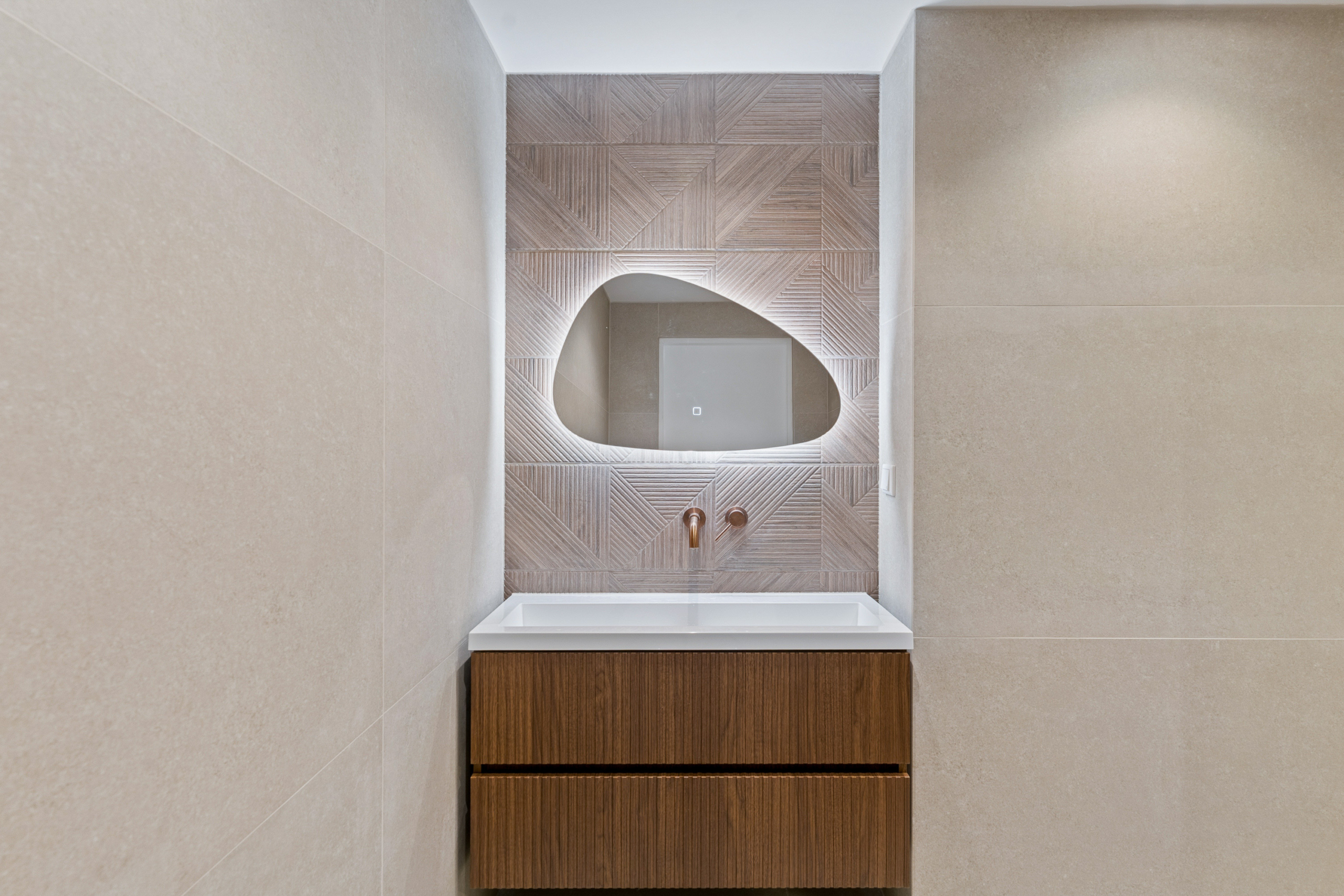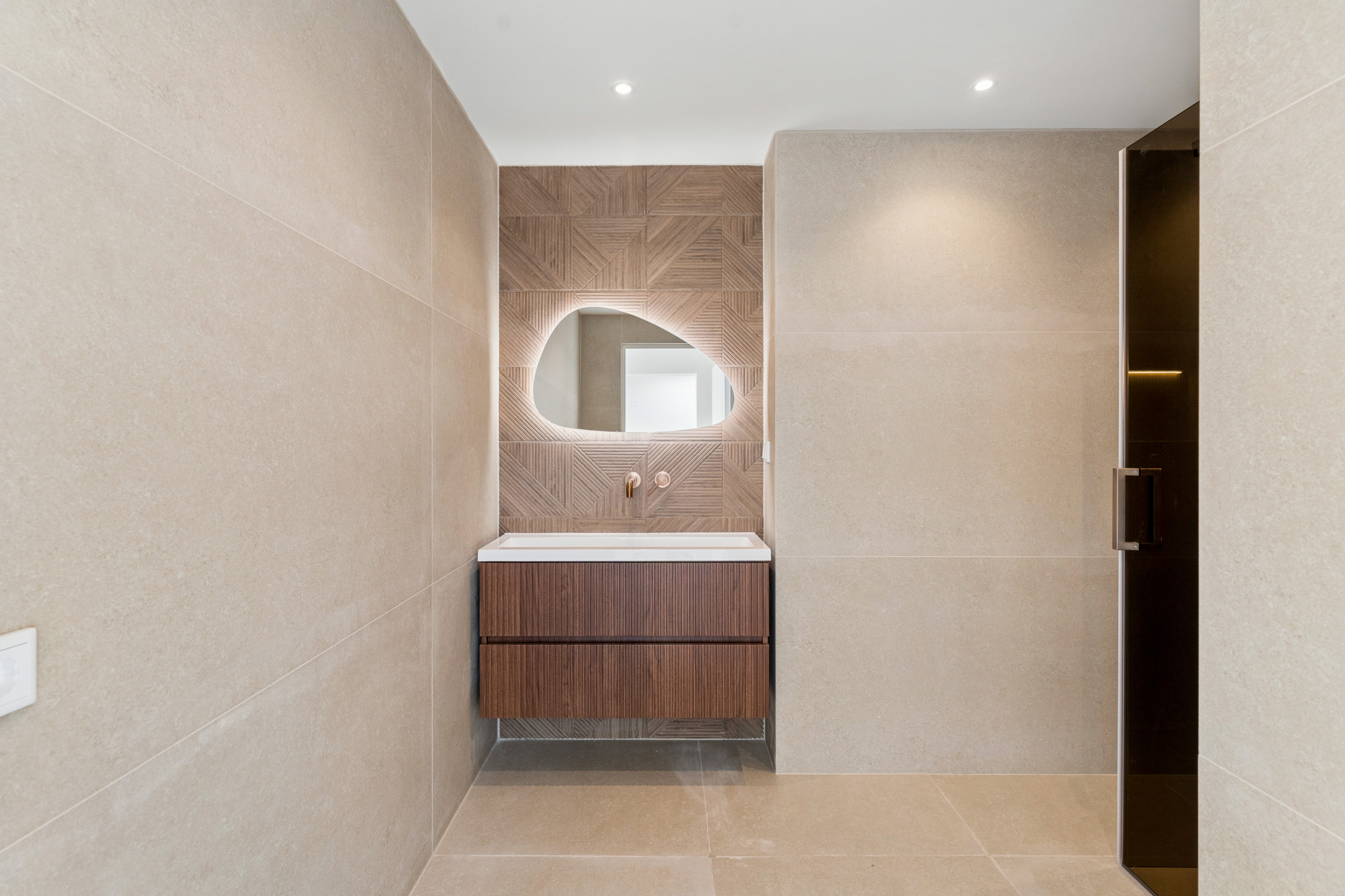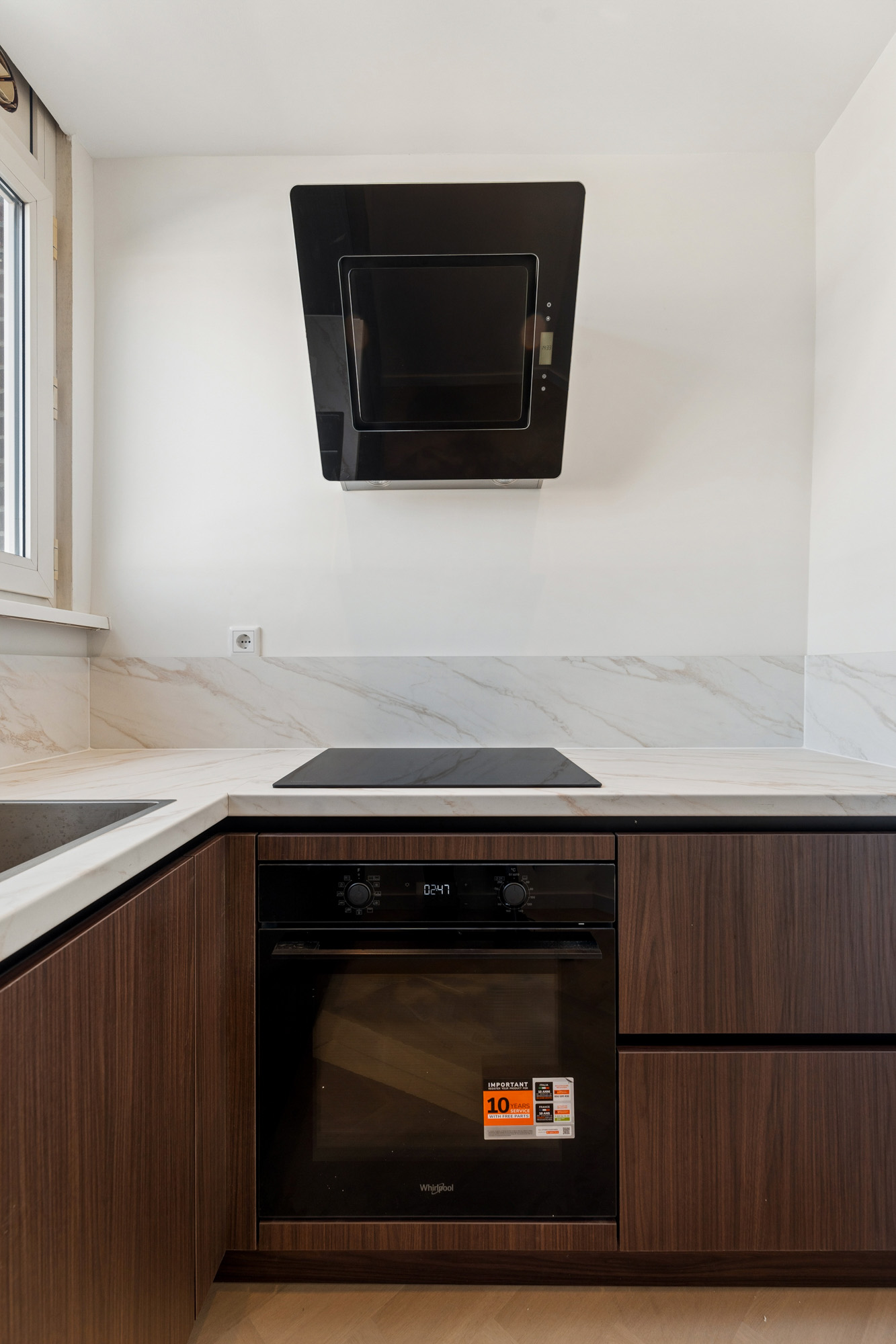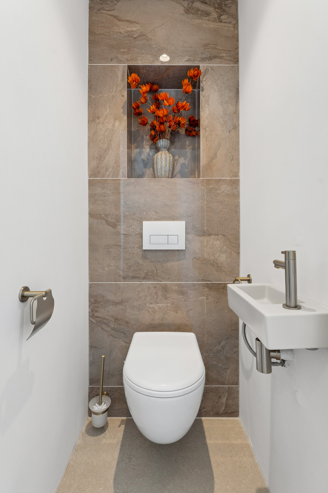 – Keuken: De moderne keuken is uitgevoerd in een stijlvolle donkere houtlook en voorzien van een licht marmerlook werkblad en achterwand. De keuken beschikt over diverse inbouwapparatuur, waaronder: Inductiekookplaat, afzuigkap, oven, spoelbak met designkraan, koelkastruimte, veel opbergruimte
