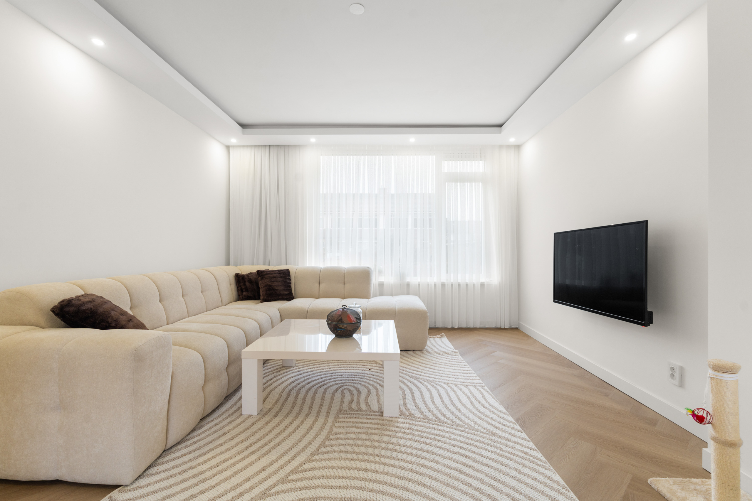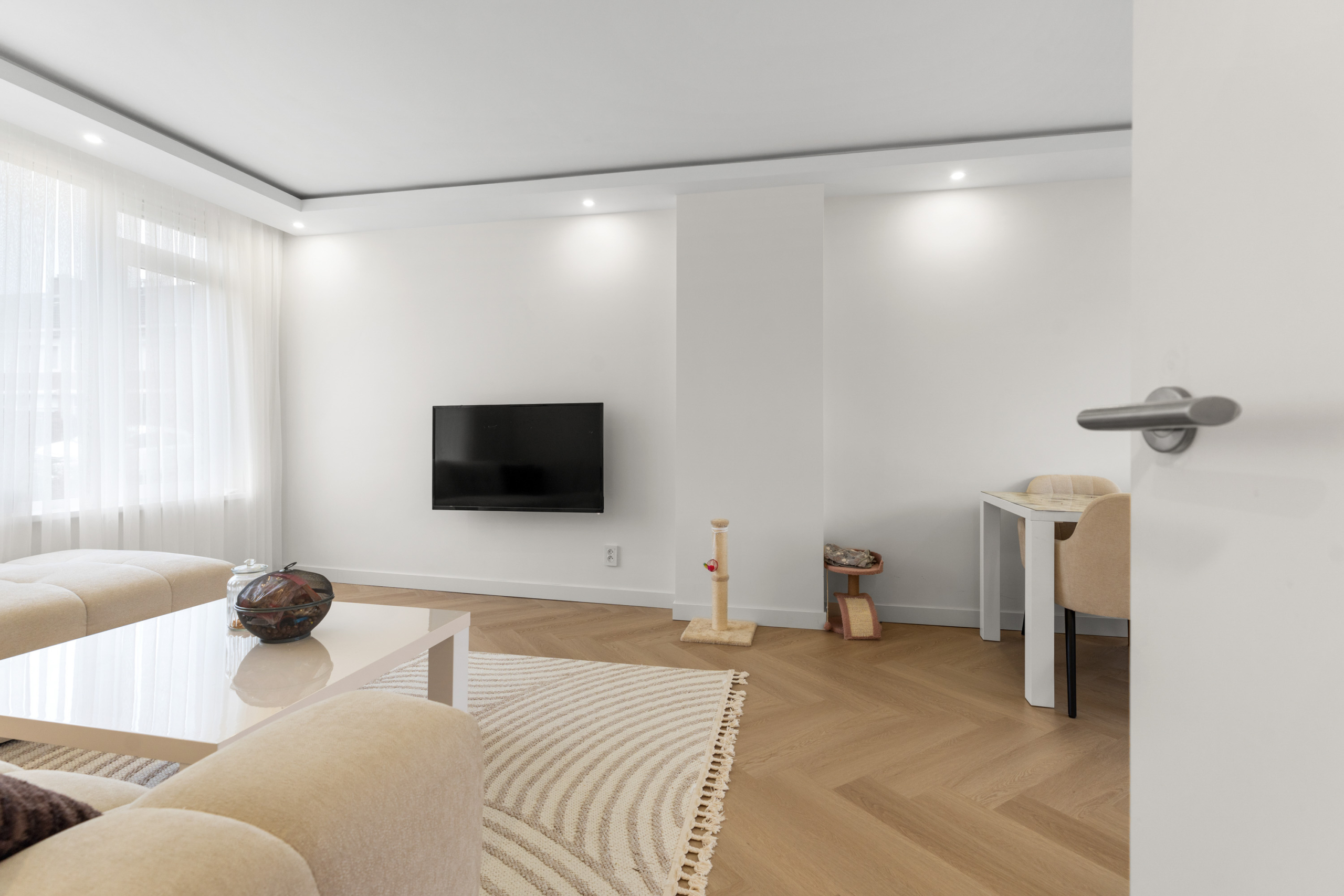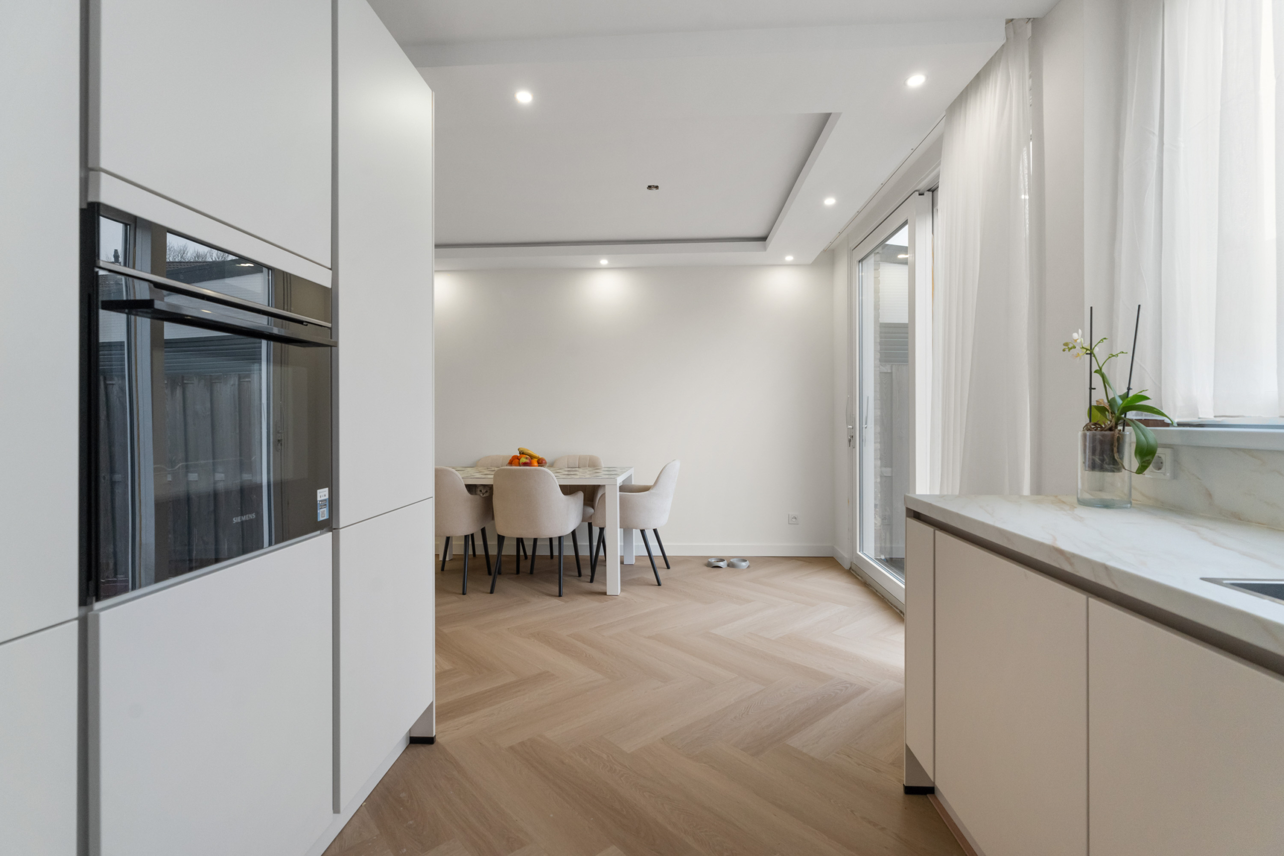 – Woonkamer: De doorzonwoonkamer is ruim en licht dankzij de grote raampartijen aan zowel de voor- als achterzijde. De ruimte is strak afgewerkt met een visgraatvloer en neutrale wandafwerking. Er is voldoende plaats voor een royale zithoek aan de voorzijde en een eethoek aan de achterzijde, met zicht op de tuin.