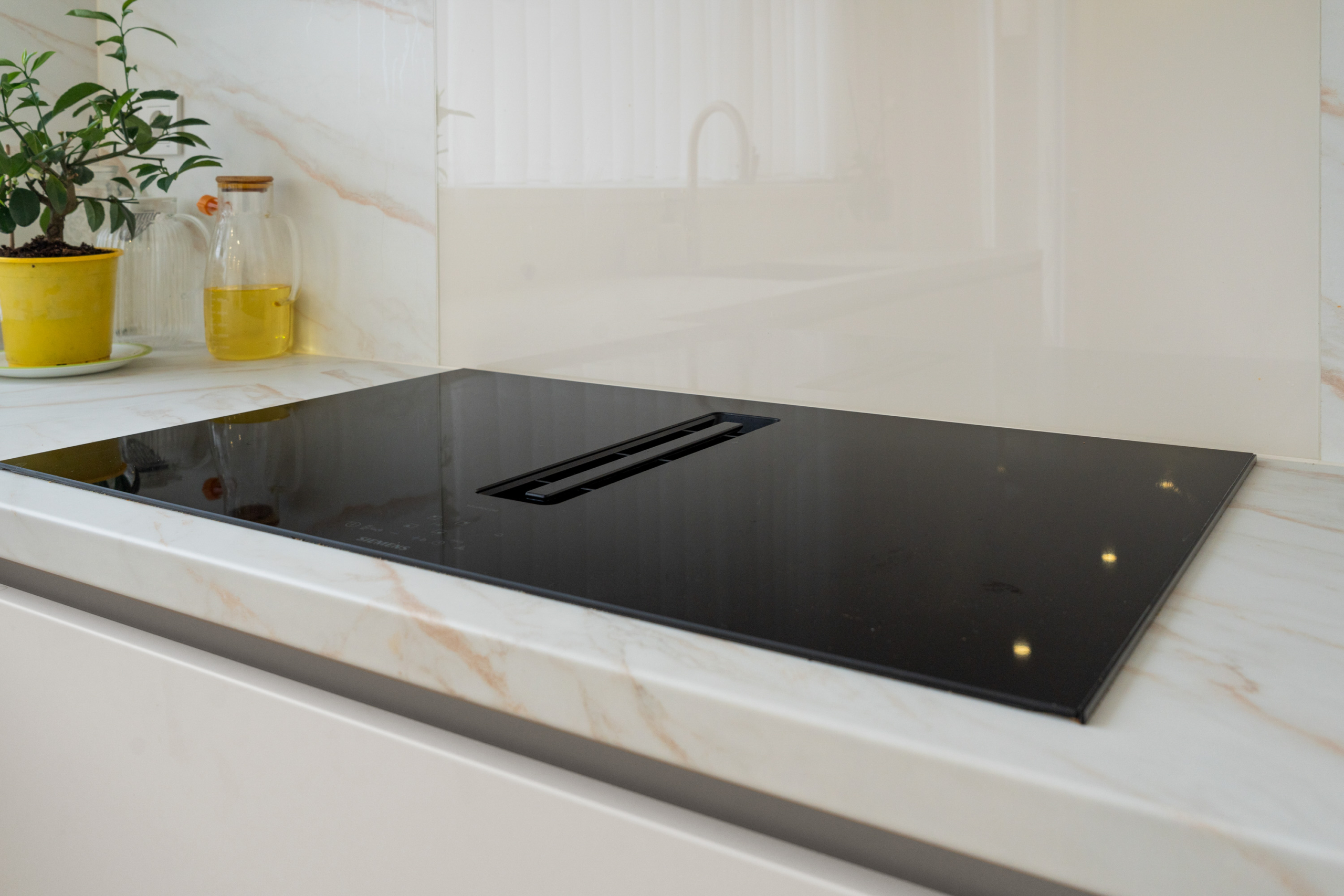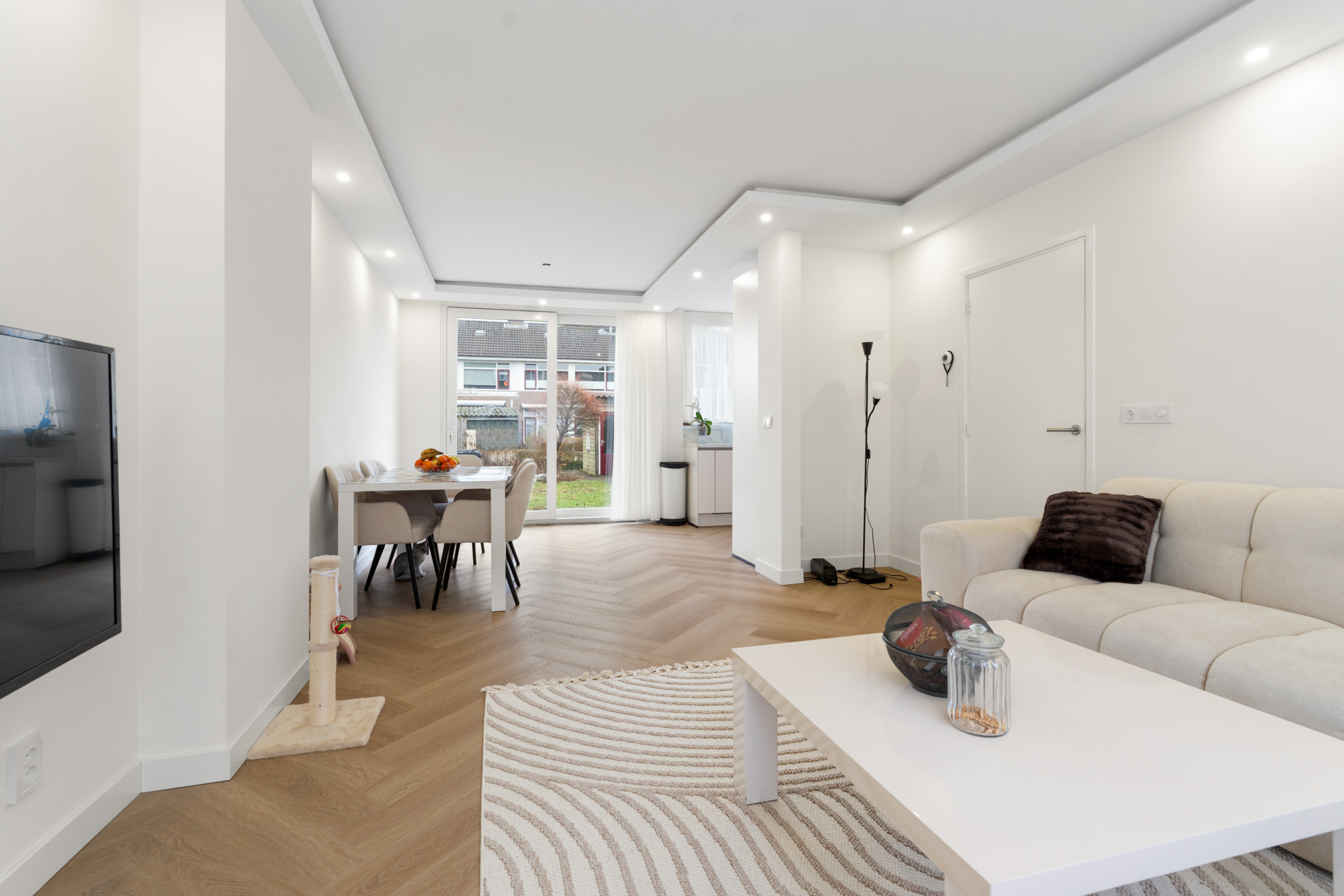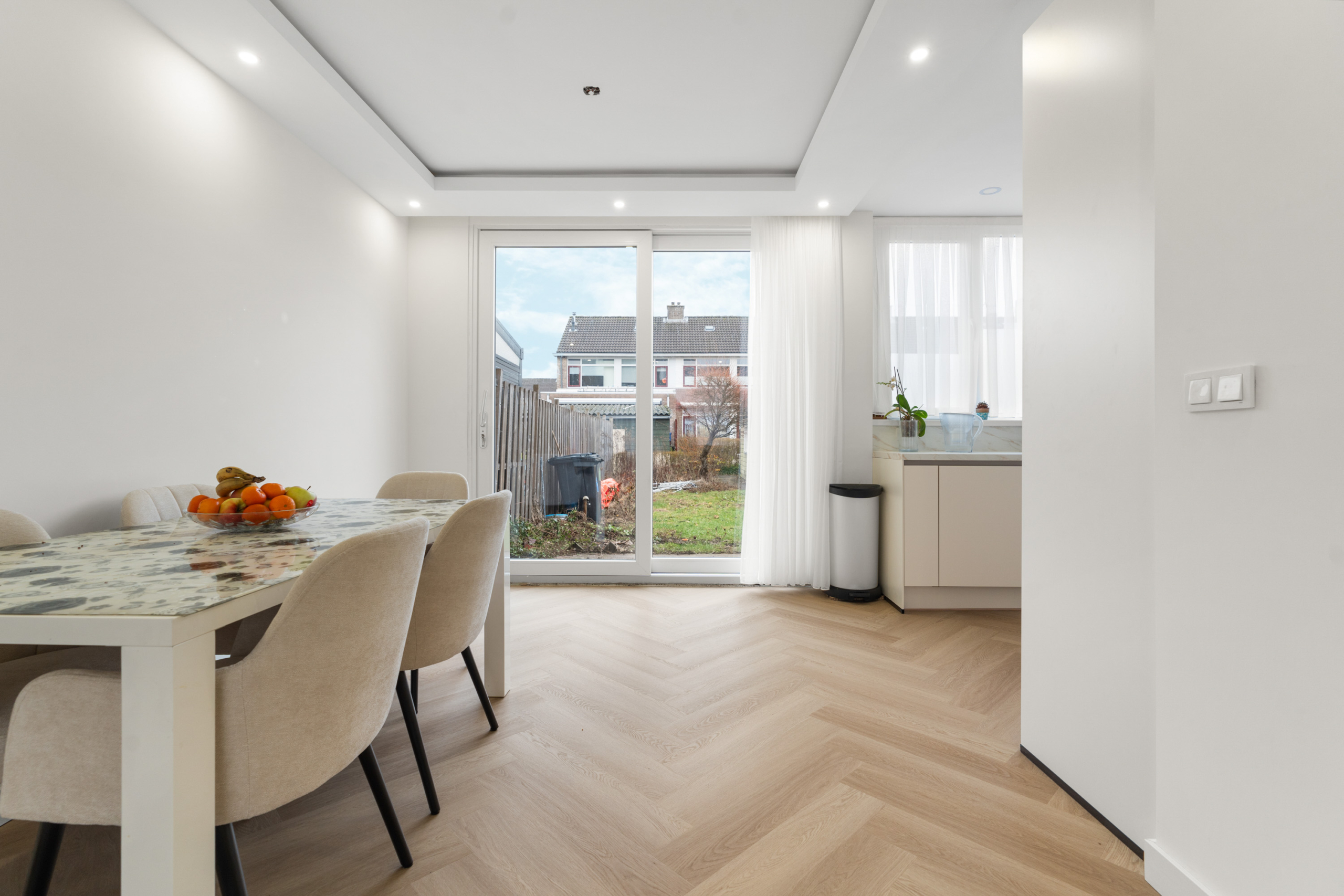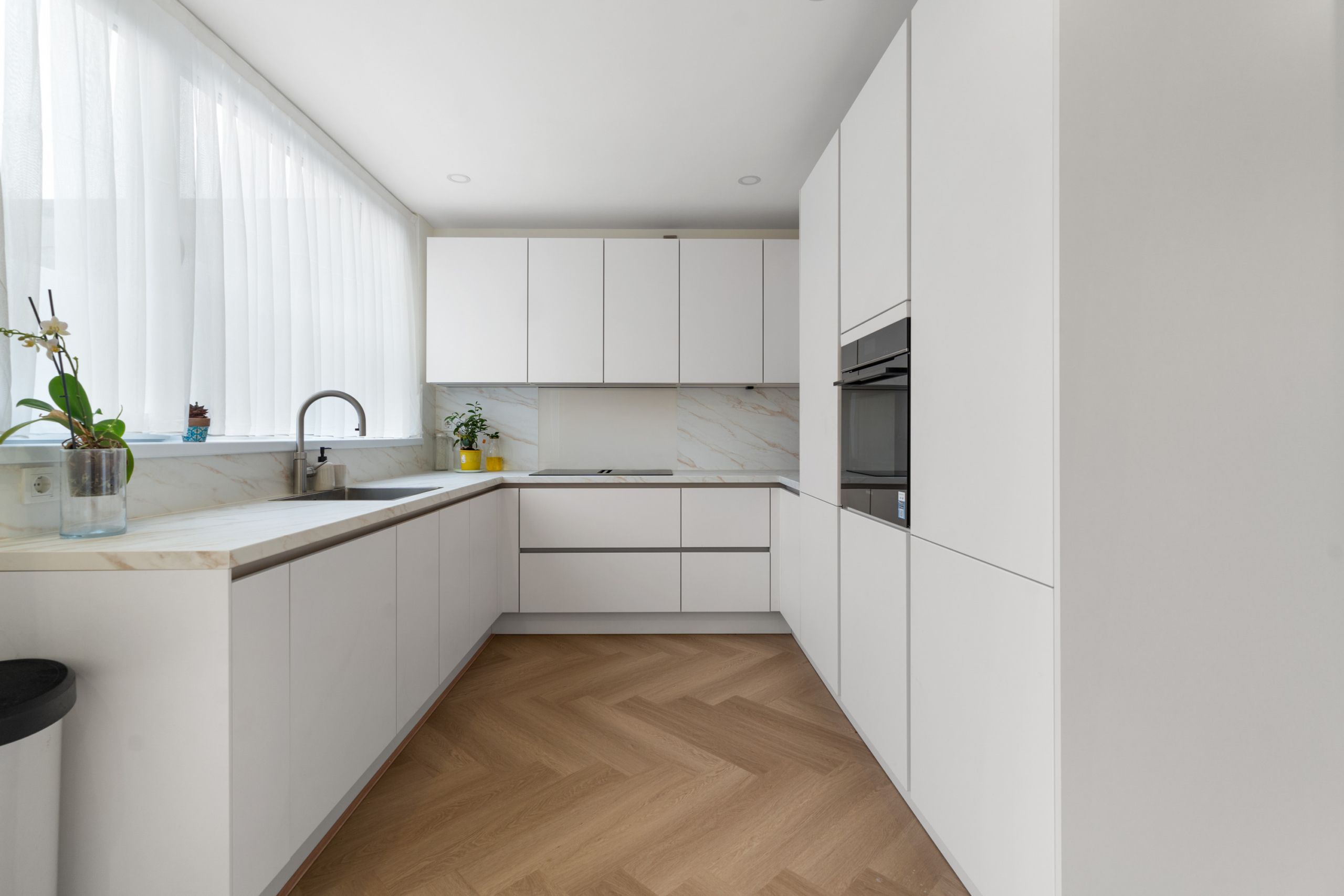– Keuken: De open keuken bevindt zich aan de achterzijde van de woning en is uitgevoerd in een moderne, lichte kleurstelling. De keuken is voorzien van een inductiekookplaat met geïntegreerde afzuiging, een inbouwoven en diverse onder- en bovenkasten voor bergruimte. Vanuit de keuken is er directe toegang tot de achtertuin.