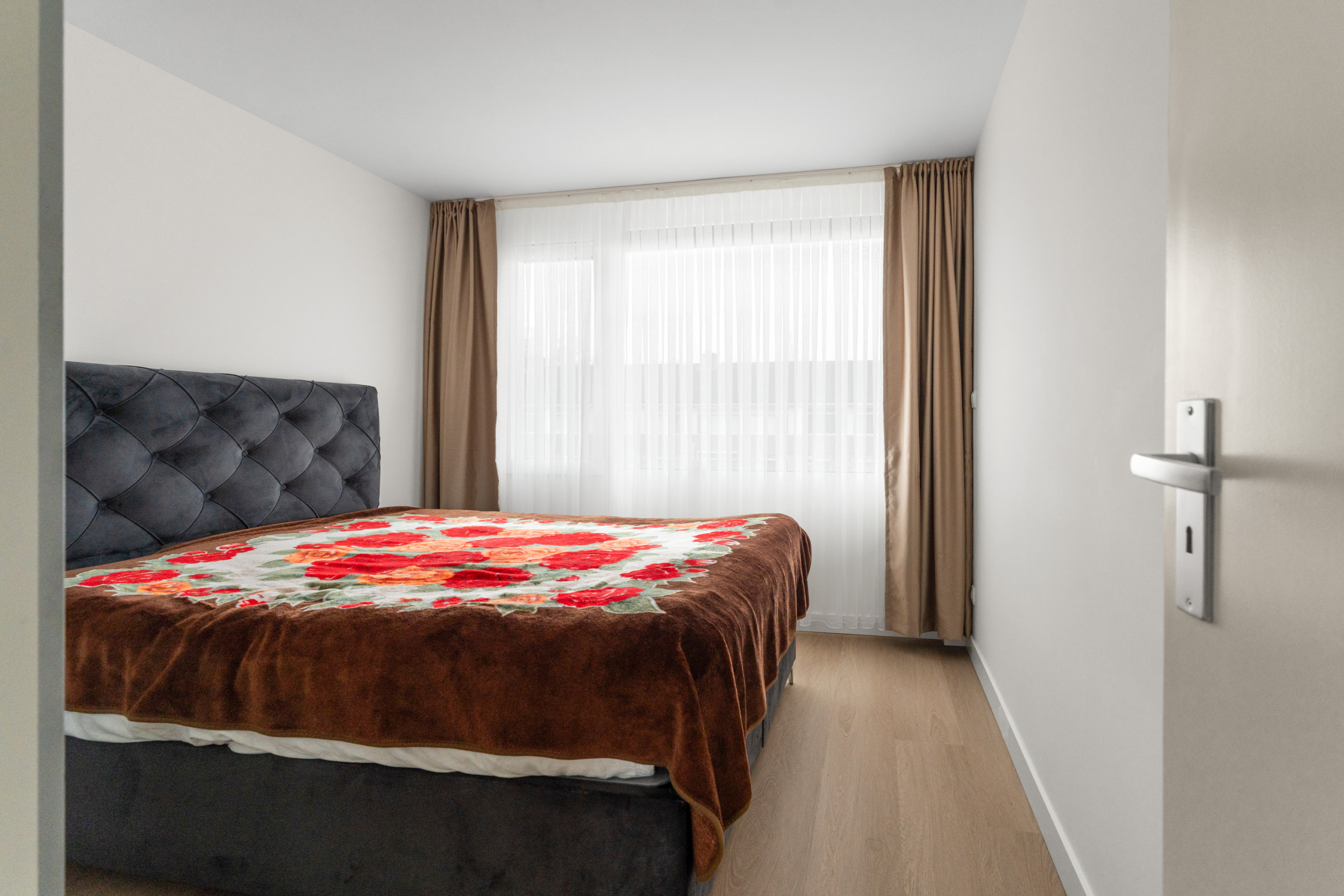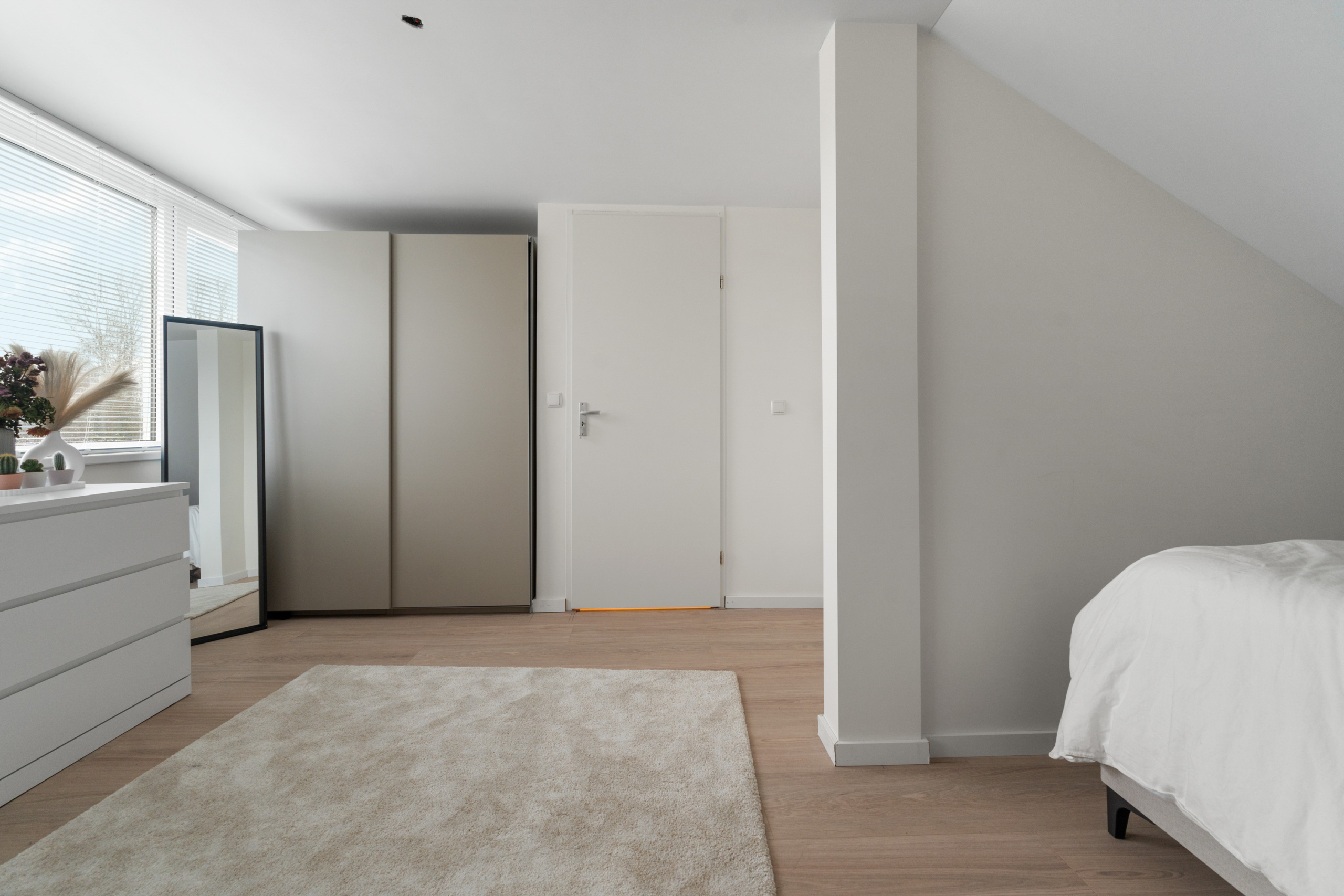 Deze slaapkamer is ruim van opzet en beschikt over een grote raampartij, waardoor er veel natuurlijk licht binnenvalt. De kamer biedt voldoende ruimte voor een tweepersoonsbed en een kledingkast. Door de praktische indeling is dit een ideale hoofdslaapkamer.