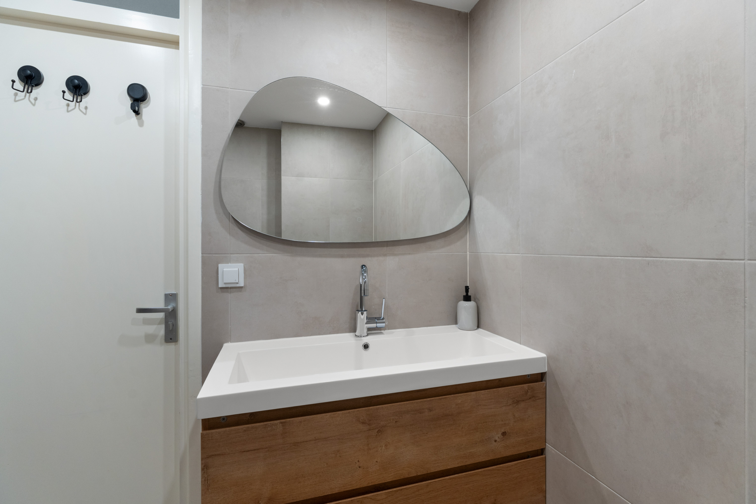 De badkamer is modern uitgevoerd en voorzien van een inloopdouche, wastafelmeubel en eigentijdse tegelafwerking. De ruimte is praktisch ingedeeld en efficiënt benut.